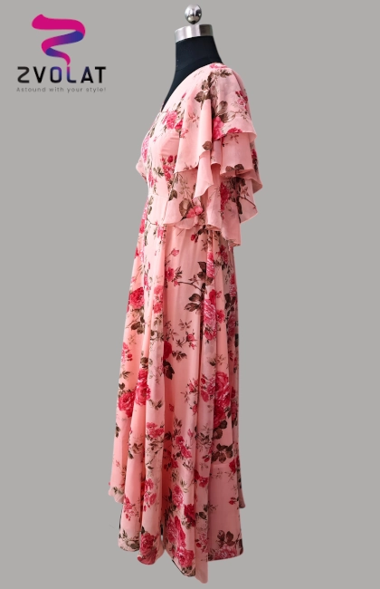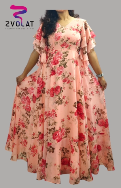 This peach georgette maxi dress showcases red floral and brown leaf prints with a flattering princess-cut bodice and V-necklines at the front and back. Two-layer ruffle sleeves and a soft ruffle at the hem add a breezy, feminine charm. Ideal for brunches, resort wear, or casual summer gatherings.