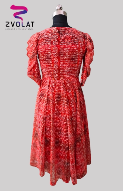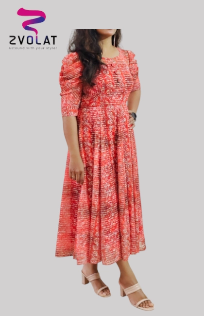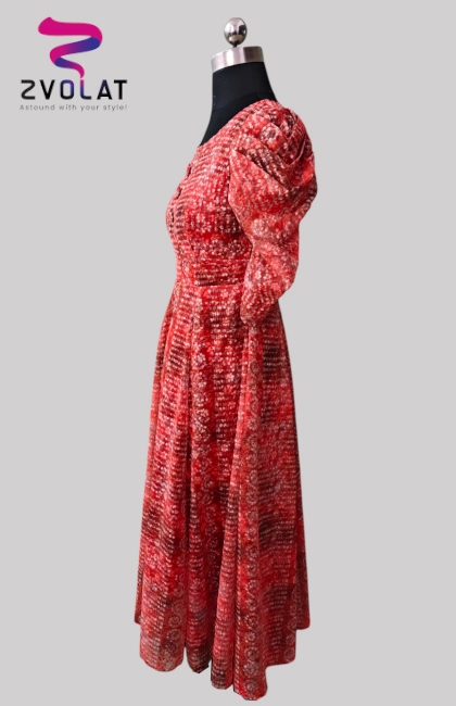 Exude effortless charm in this rusty red embroidered georgette dress, crafted with a flattering princess-cut bodice and a flowing panel skirt. The elegant front buttons and a sleek waist belt add structure, while the delicate puffed half sleeves with cuff detailing bring a soft, feminine touch.